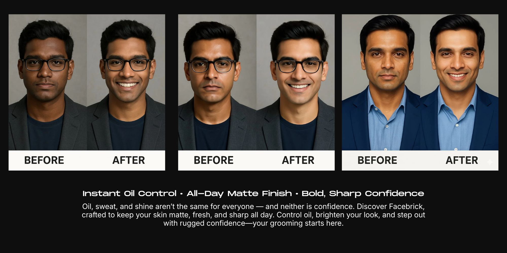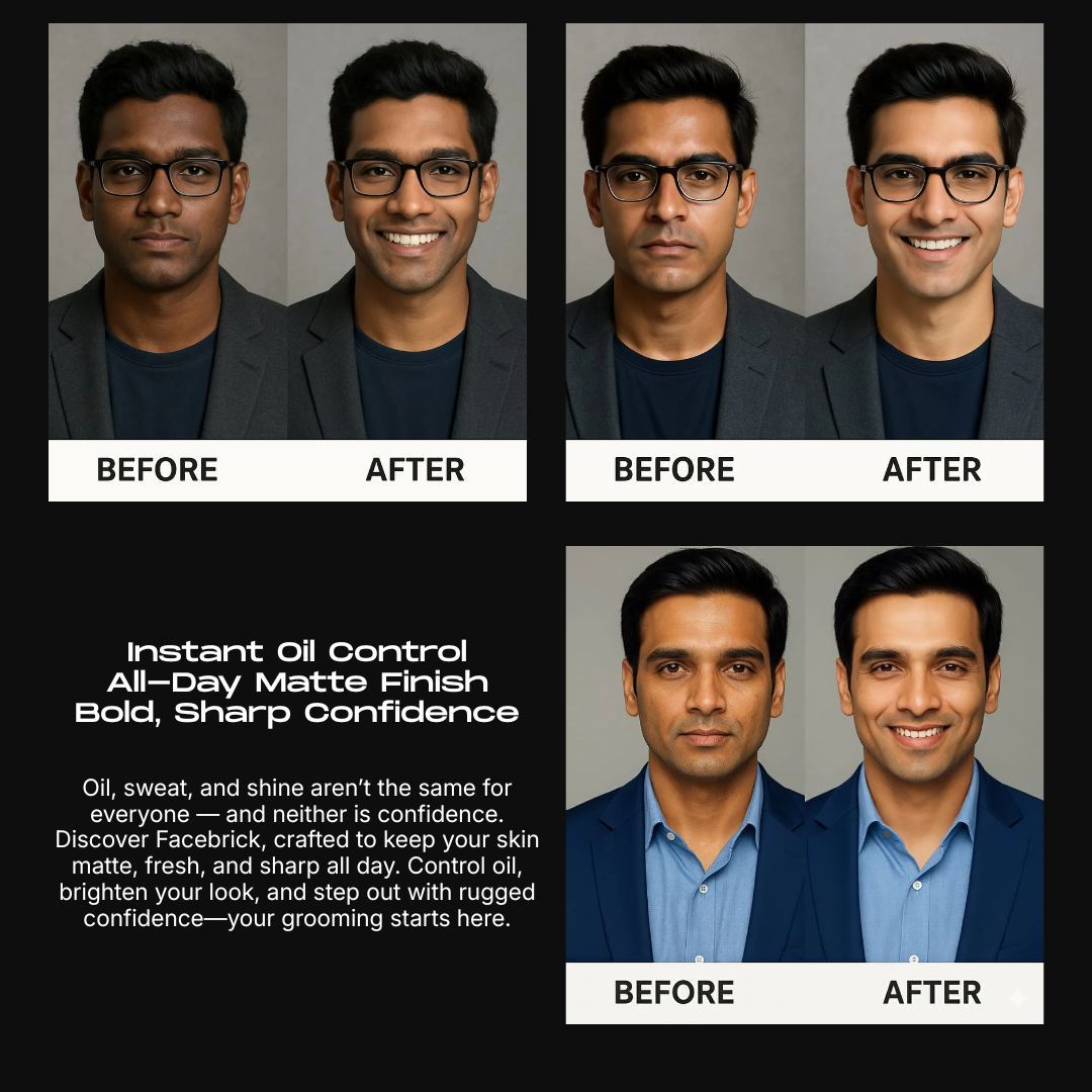 You step out of the shower, Get ready for work, look in the mirror, and need one thing: a clean, matte, confident face—no stickiness, no fuss. Facebrick is a Revolutionary face tool built for that exact moment. Kholo. Ragdo. Failalo. Done.